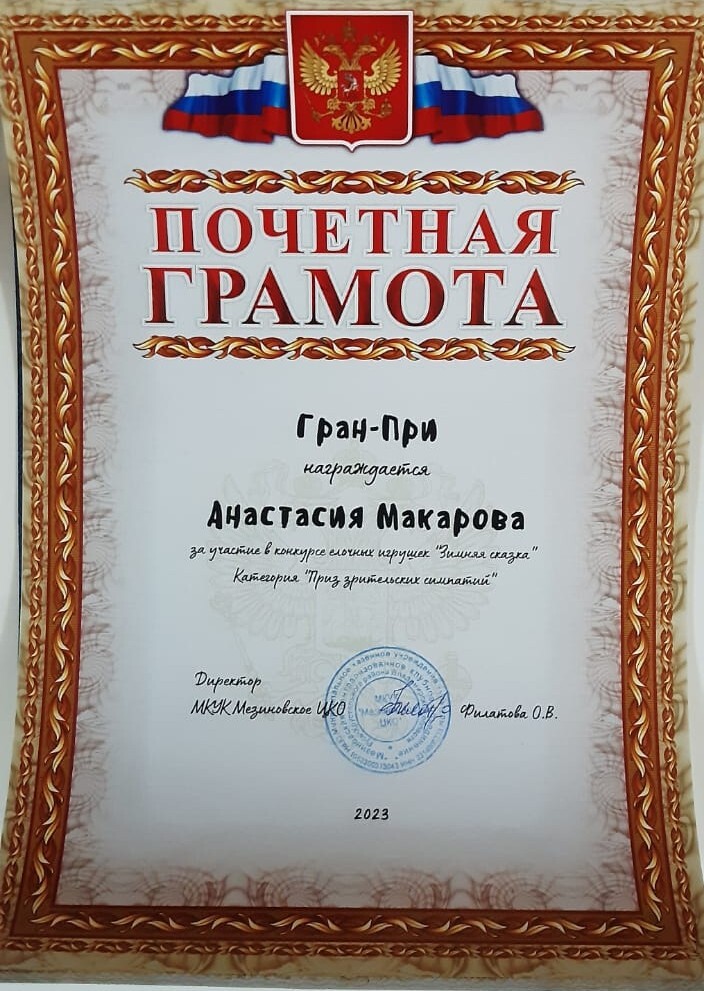 Конец 2022 года оказался богат на всякого рода мероприятия, и в каждом из них воспитанники и сотрудники нашего сада старались принять участие. Вот и на этот раз наши ребята поучаствовали в новогоднем конкурсе елочных игрушек "Зимняя сказка", организованном МКУК Мезиновское ЦКО. Труды детей и воспитателей оказались не напрасными. Наши ребята и воспитатели стали призёрами этого конкурса. Мы поздравляем всех участников этого новогоднего мероприятия и желаем дальнейших творческих успехов.