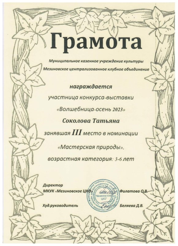 ????В период с 12 по 30 сентября 2023 года в МКУК Мезиновское ЦКО проходил конкурс поделок из природного материала "Волшебница-осень 2023", в котором самое активное участие принимали воспитанники нашего сада. Ребята представили свои конкурсные работы сразу по всем номинациям. Сегодня прошло награждение призёров и участников конкурса Мезиновского дома культуры.
