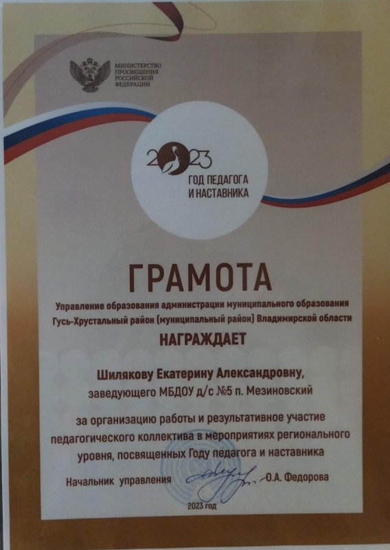 ????????19 декабря 2023 года в актовом зале управления образования администрации Гусь-Хрустального района состоялось торжественное мероприятие, посвященное закрытию Года педагога и наставника. За организацию работы и активное участие педагогического коллектива в мероприятиях, посвященных Году педагога и наставника, была награждена Екатерина Александровна Шилякова, заведующий нашего детского сада №5 п. Мезиновский.