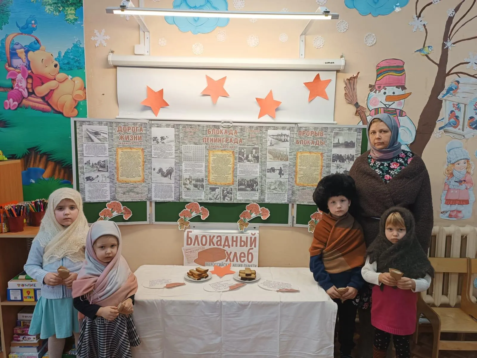 Воспитанники старшей (3-х возрастной) группы сегодня посетили Мезиновскую библиотеку. Библиотекарь Балдова Наталья Алексеевна рассказала о блокаде Ленинграда, посредством презентации познакомила детей с «Карточками на хлеб». Также с детьми старшей (3-х возрастной) группы было проведено тематическое мероприятие, началось которое с беседы "900 дней голода и холода "