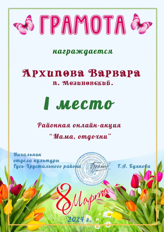 В преддверии международного женского дня наши ребята приняли активное участие в районных онлайн - акциях "Время женщин" и "Вам, любимые", а также в фото -конкурсе "Мама,отдохни", организованных Отделом культуры Гусь-Хрустального района.