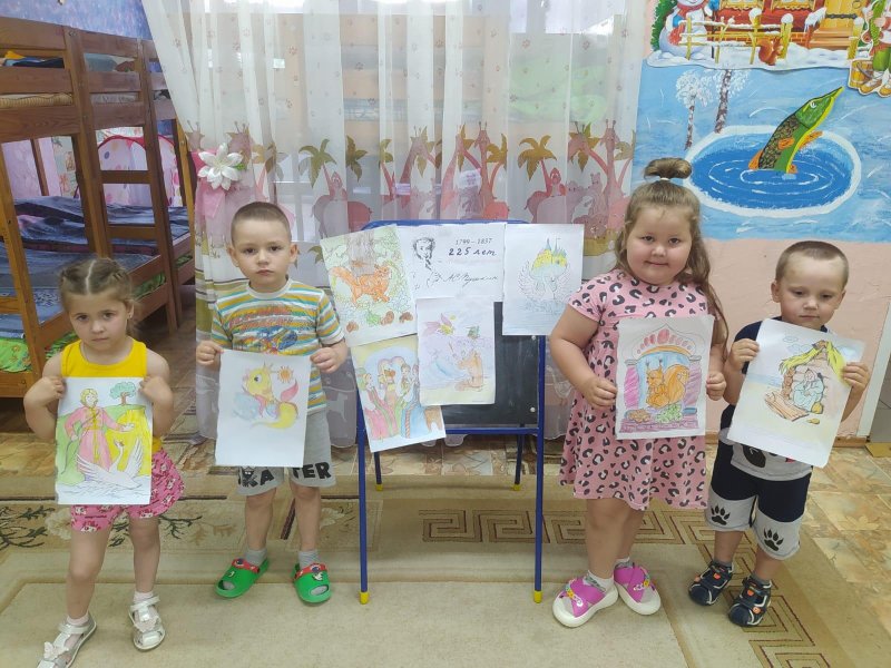 По этому случаю для ребят 2-ой младшей -средней группы сегодня была проведена беседа " Наш Пушкин", ребята стали участниками викторины, где путешествовали по сказкам поэта, а также раскрашивали героев из сказок А. С. Пушкина.