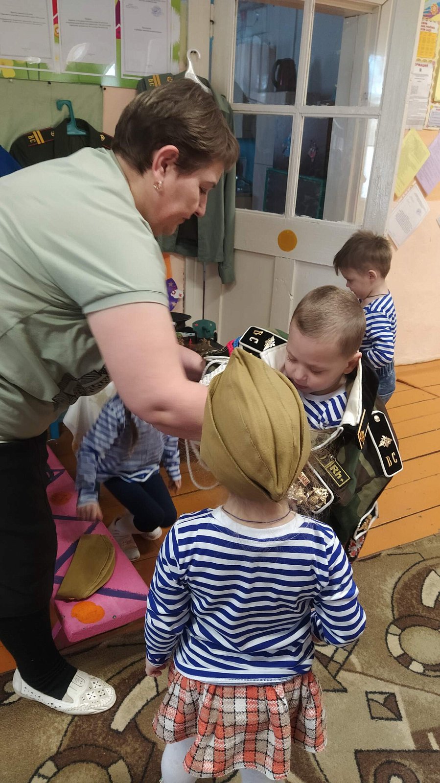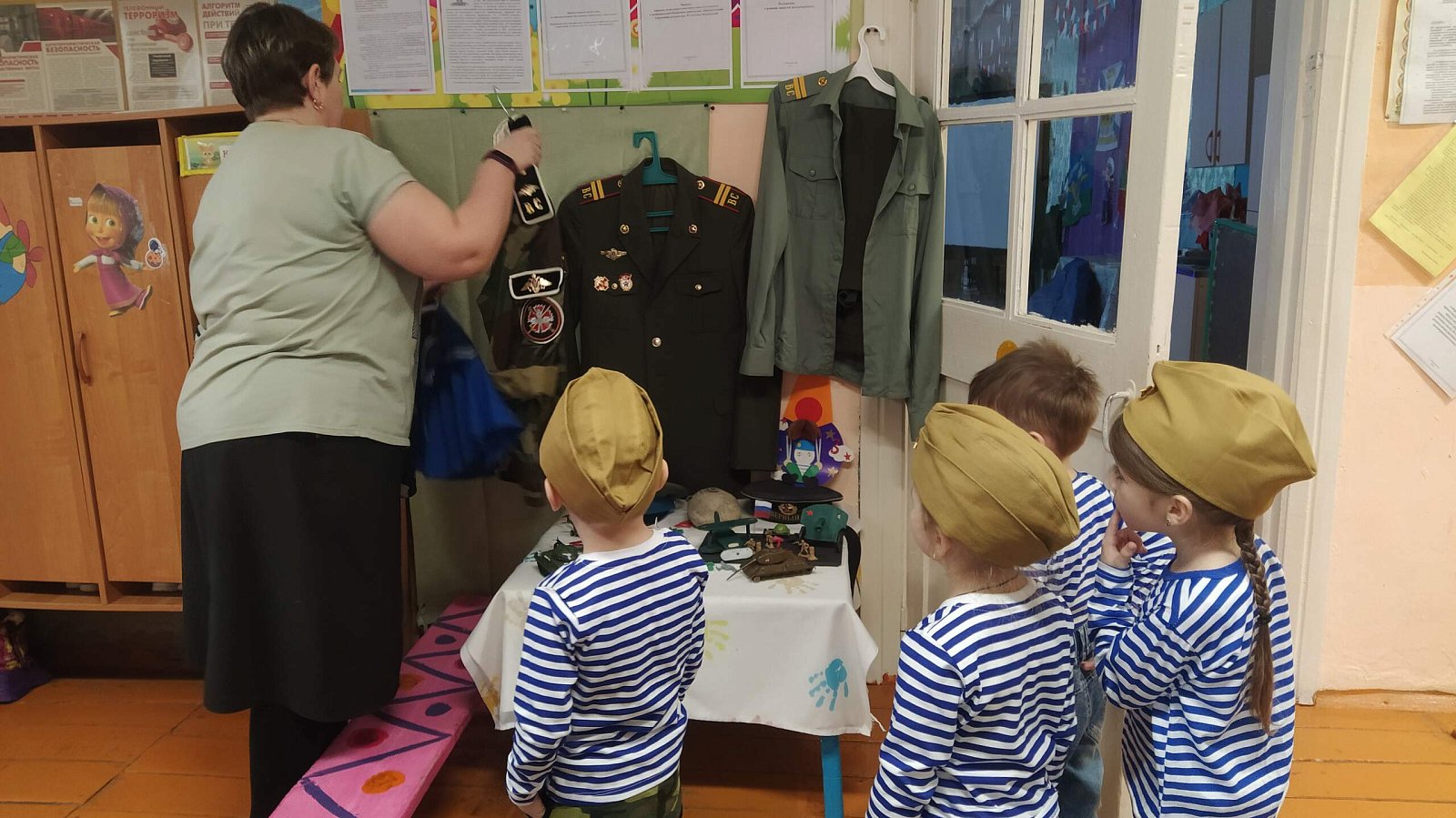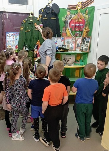 Выставка функционировала в фойе нашего сада. В процессе беседы и разглядывания экспонатов дети наглядно смогли познакомиться с одеждой различных родов войск, рассказать о своих папах и дедушках, служивших в армии. Не обошлась беседа и без примерки военной одежды. Наши мальчики побывали в роли настоящих солдат.
