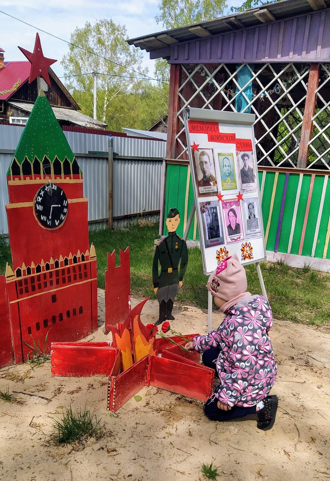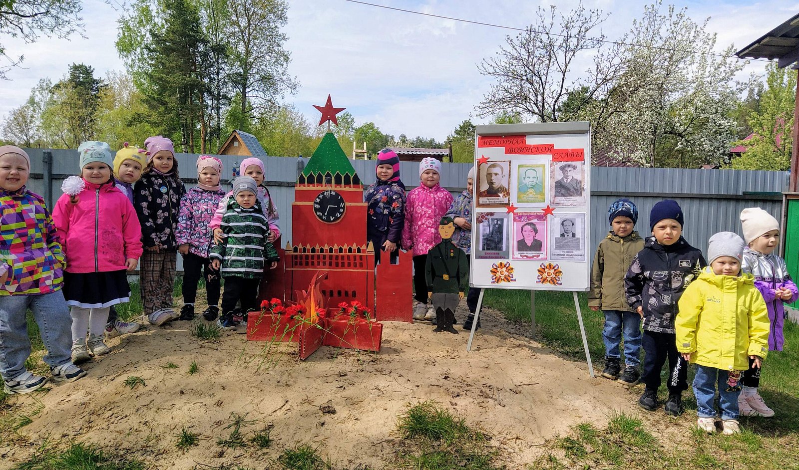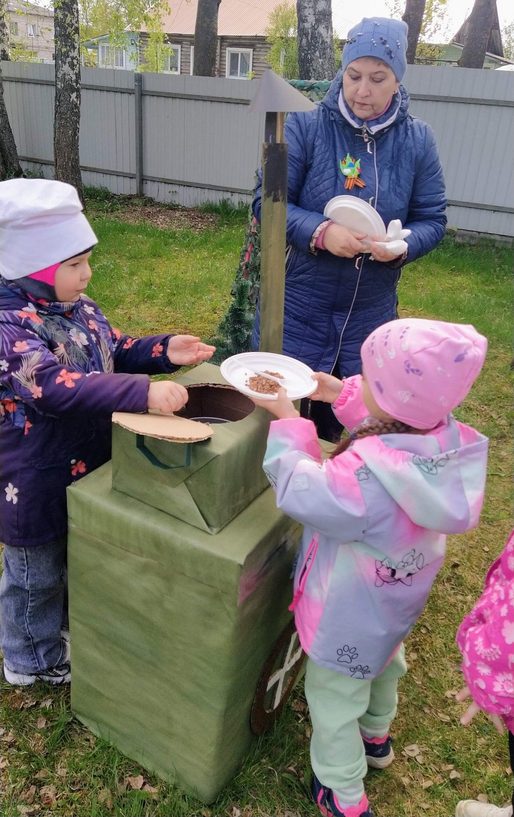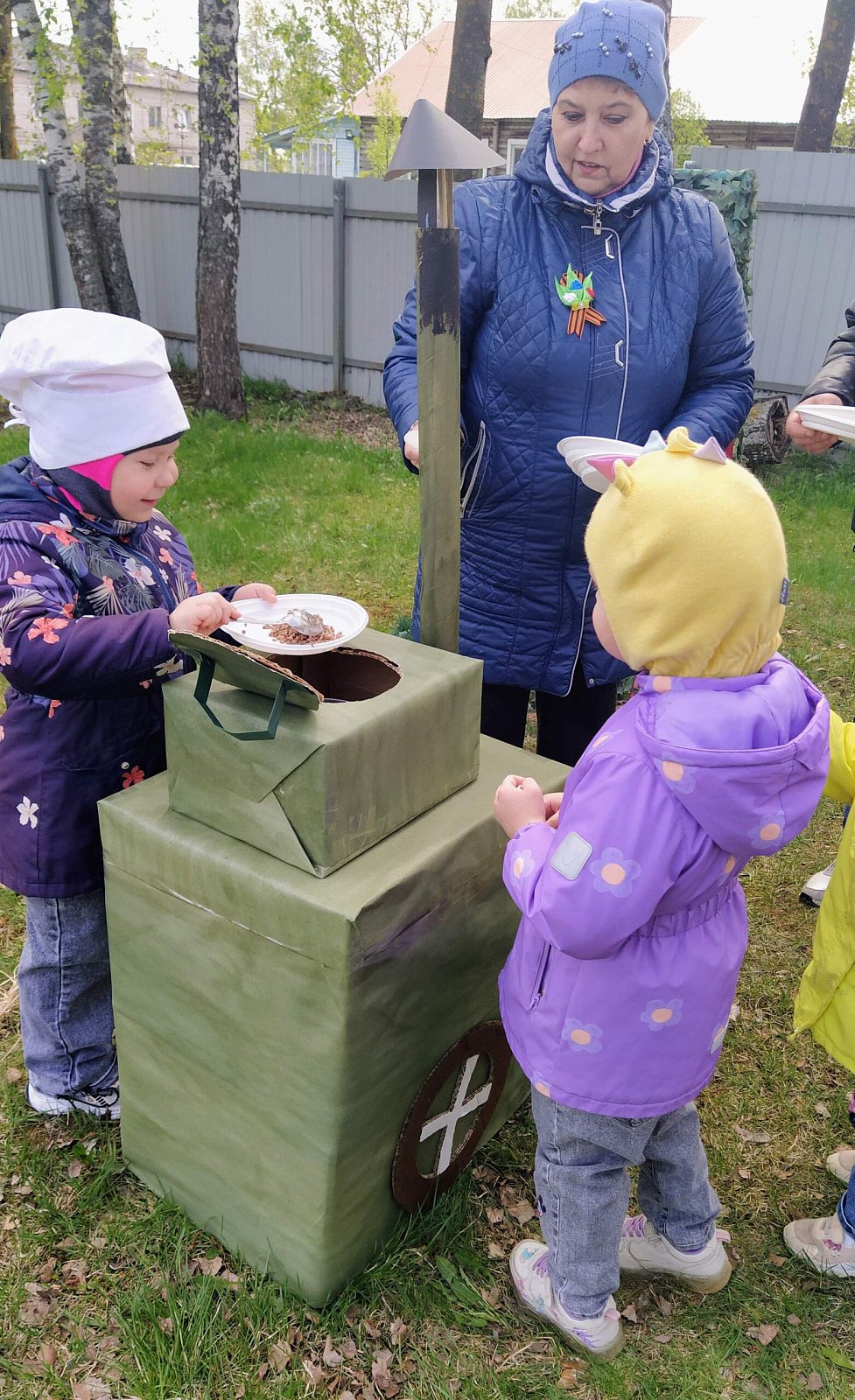 Далее праздничное действо перенеслось на участок сада, где для наших дошколят была организована полевая кухня. Насытившись кашей, дети возложили цветы к созданному нашими воспитателями "Мемориалу воинской славы".