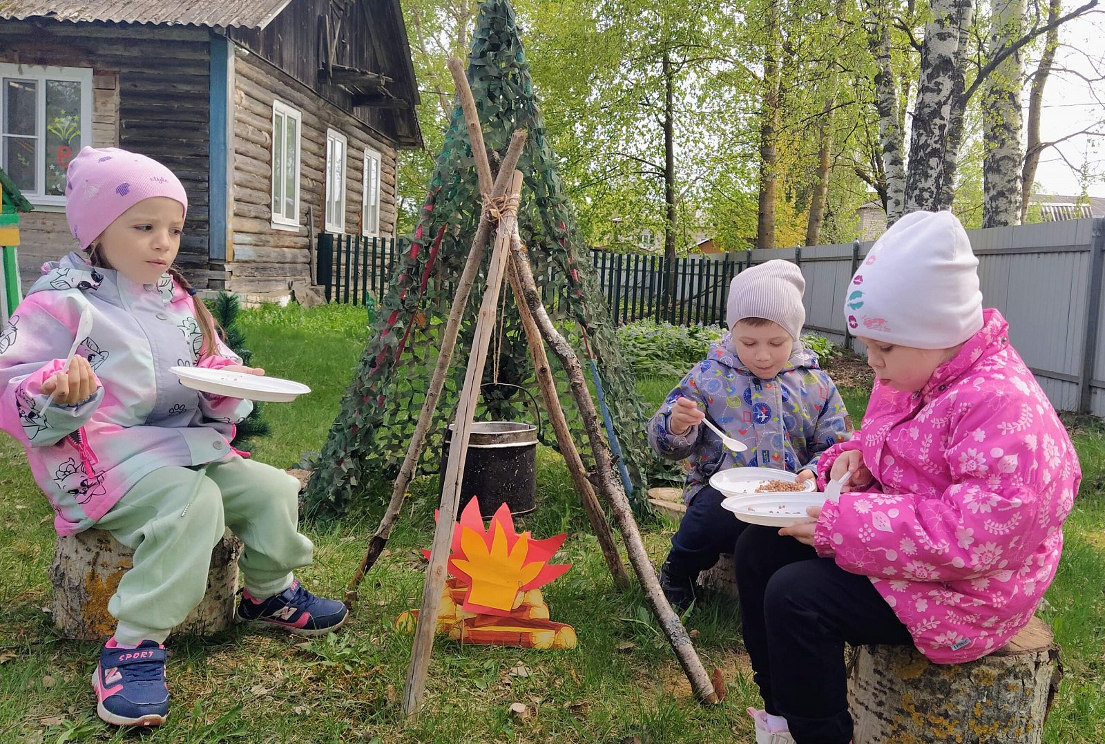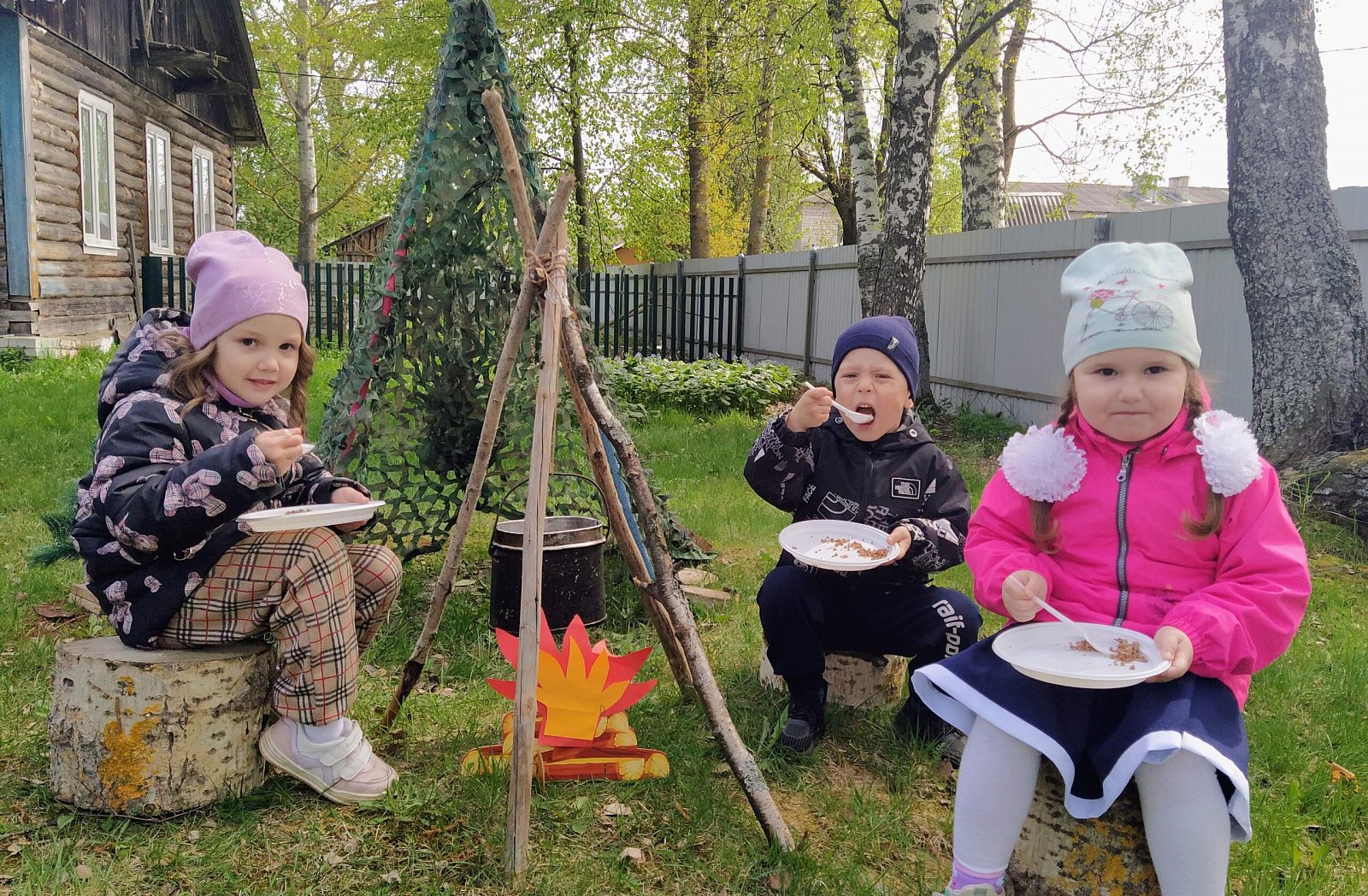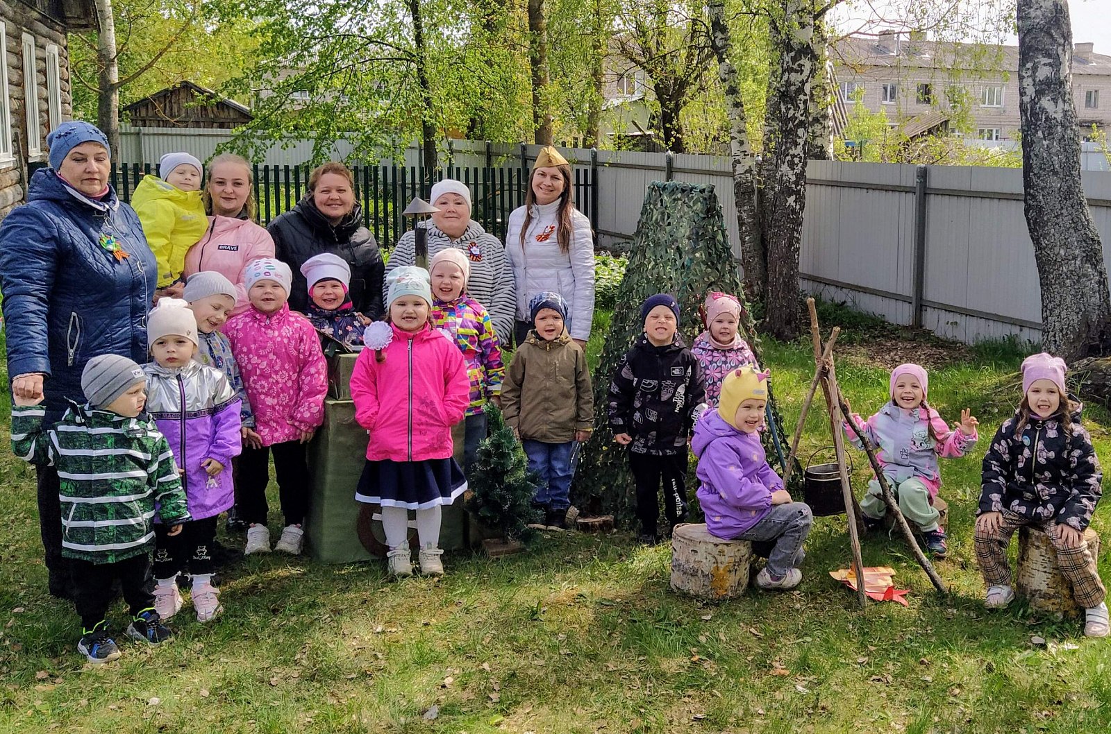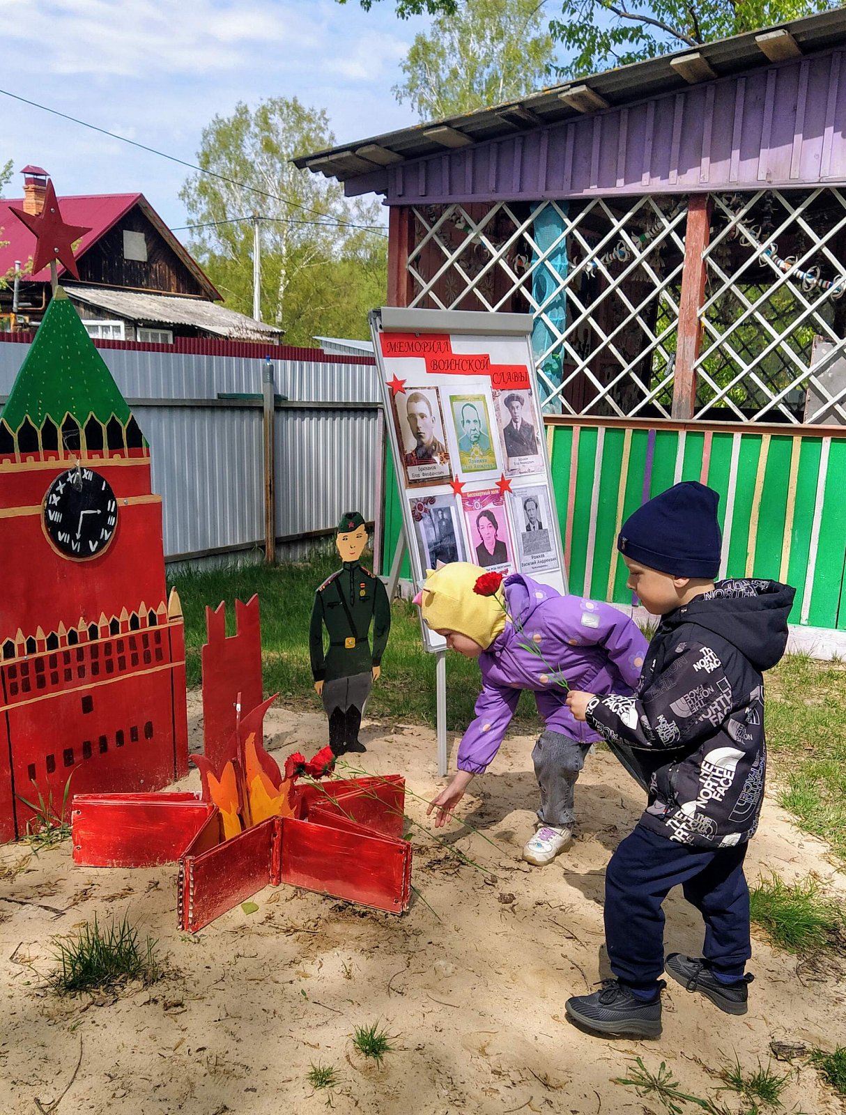 Далее праздничное действо перенеслось на участок сада, где для наших дошколят была организована полевая кухня. Насытившись кашей, дети возложили цветы к созданному нашими воспитателями "Мемориалу воинской славы".