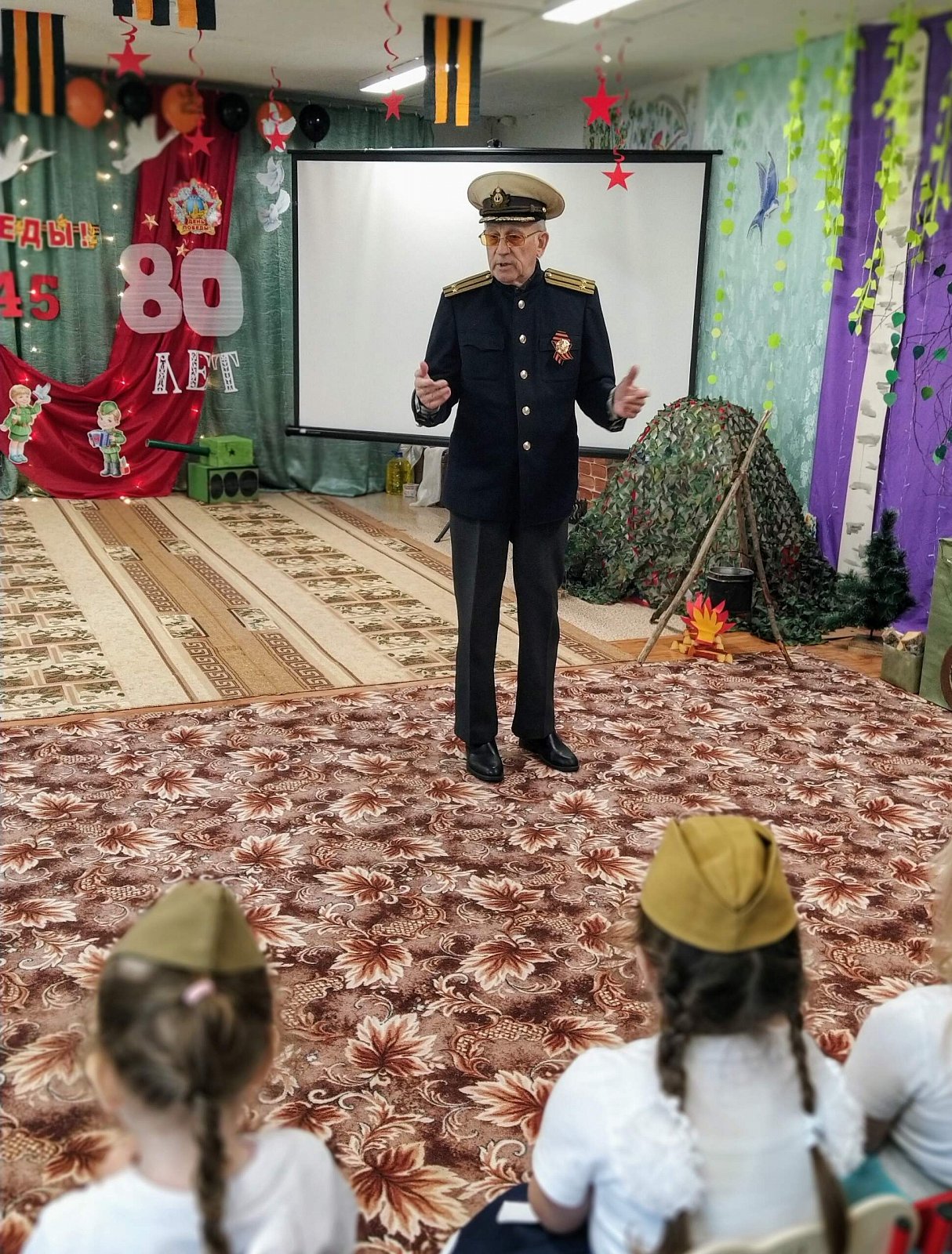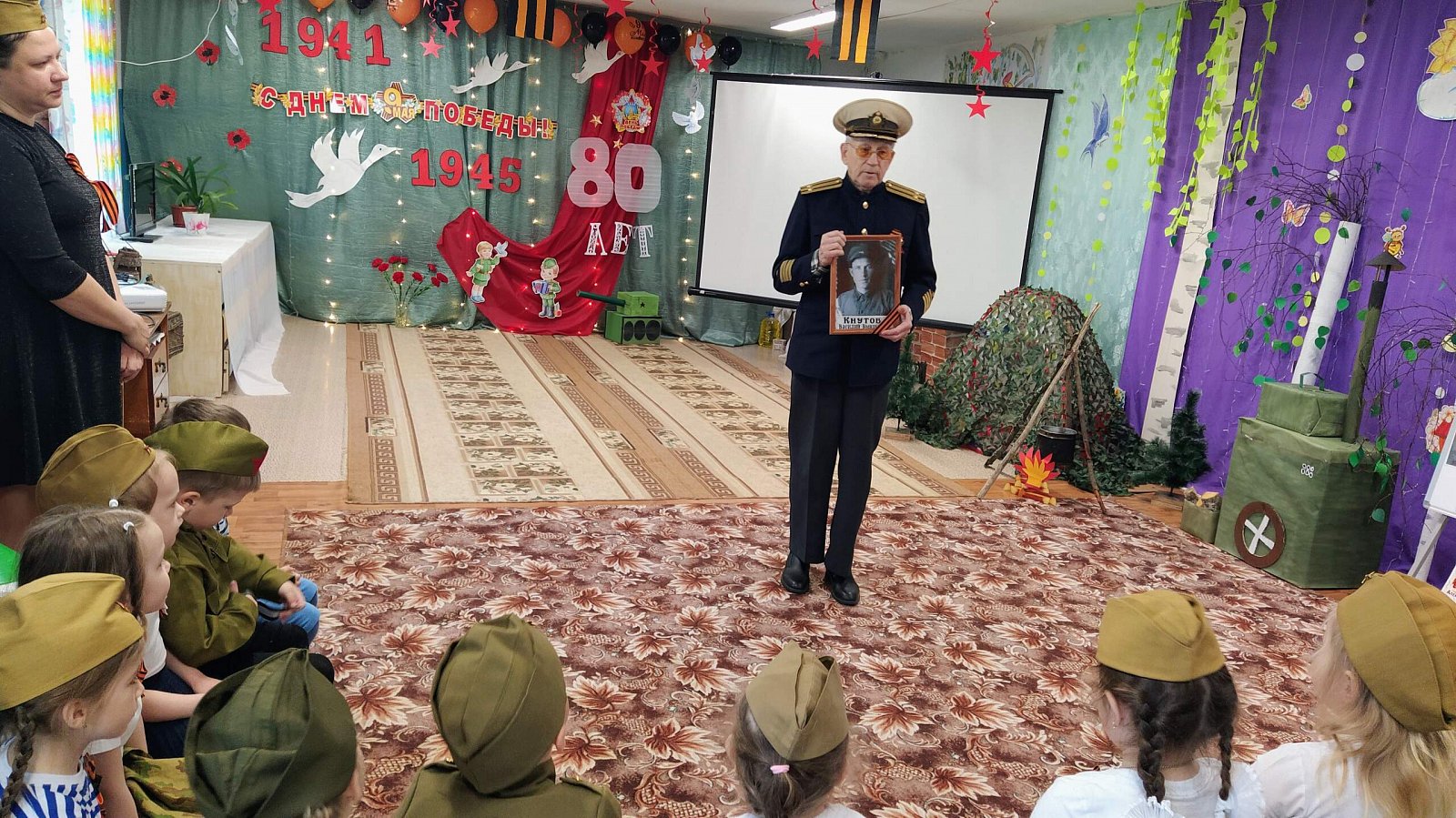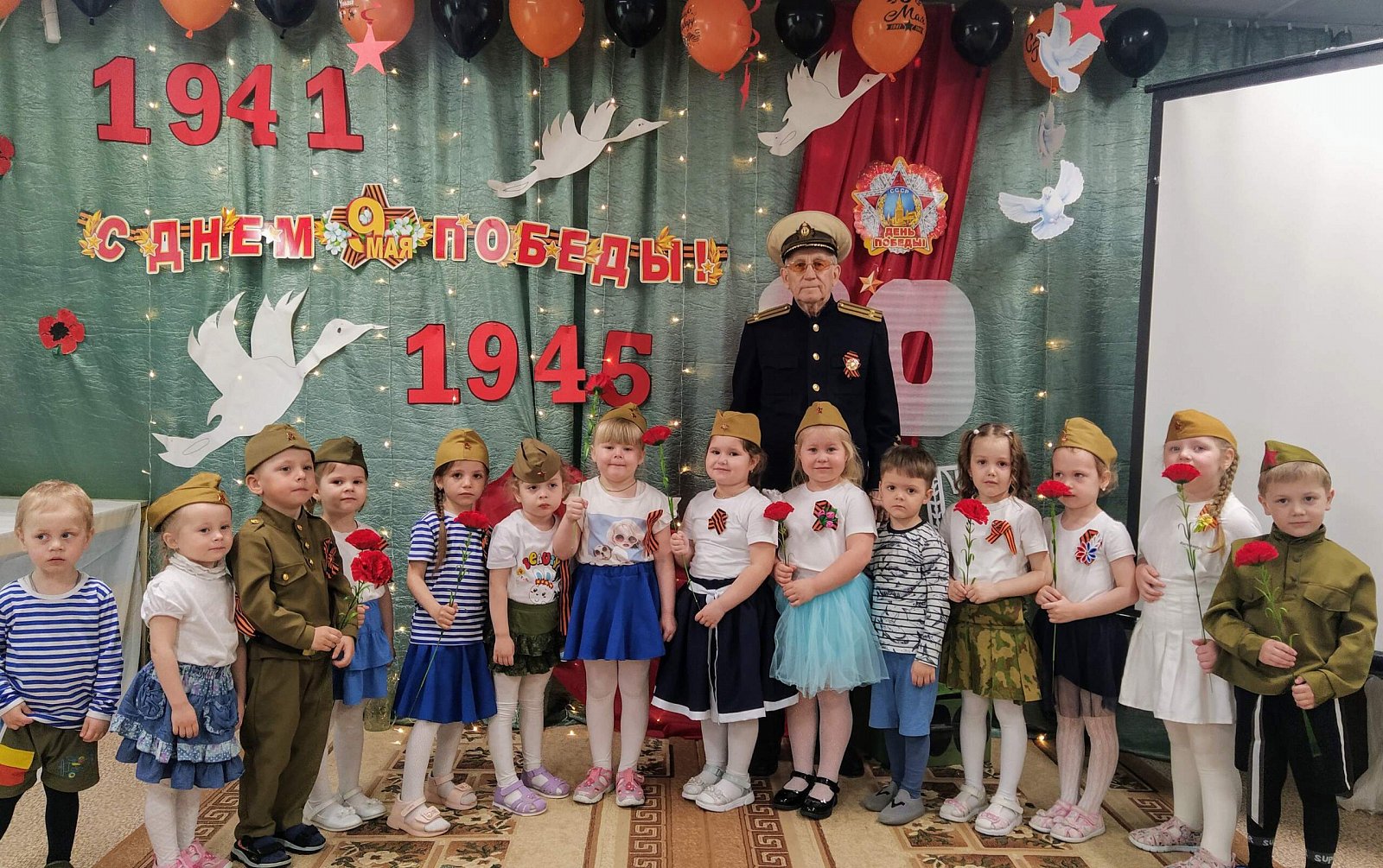 На праздник в качестве почетного гостя был приглашен бывший сотрудник нашего детского сада, а нынче пенсионер, имеющий статус "ребенок войны" Кнутов Владимир Васильевич, музыкальный руководитель. Он рассказал ребятам о своем тяжёлом детстве во время войны, о своем отце, который ушёл защищать нашу Родину. ????????