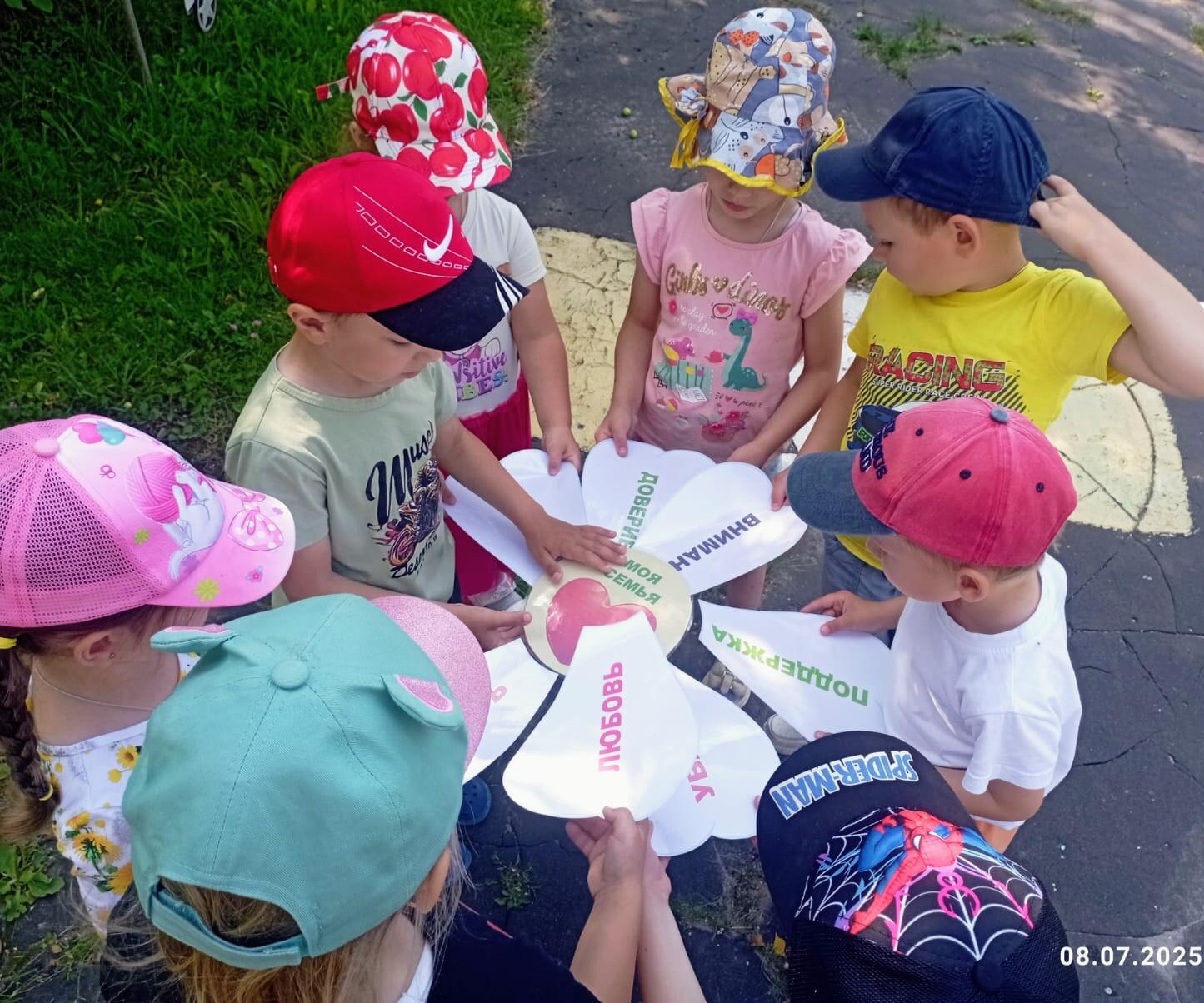 Сегодня для наших ребят был организован тематический день, посвященный празднованию Дня семьи, любви и верности. Воспитатель познакомила детей с историей возникновения этого праздника, рассказала детям о любви князя Петра и простолюдинки Февронии - хранителях семьи и брака. Воспитанники узнали, что ромашка является символом этого светлого праздника.
