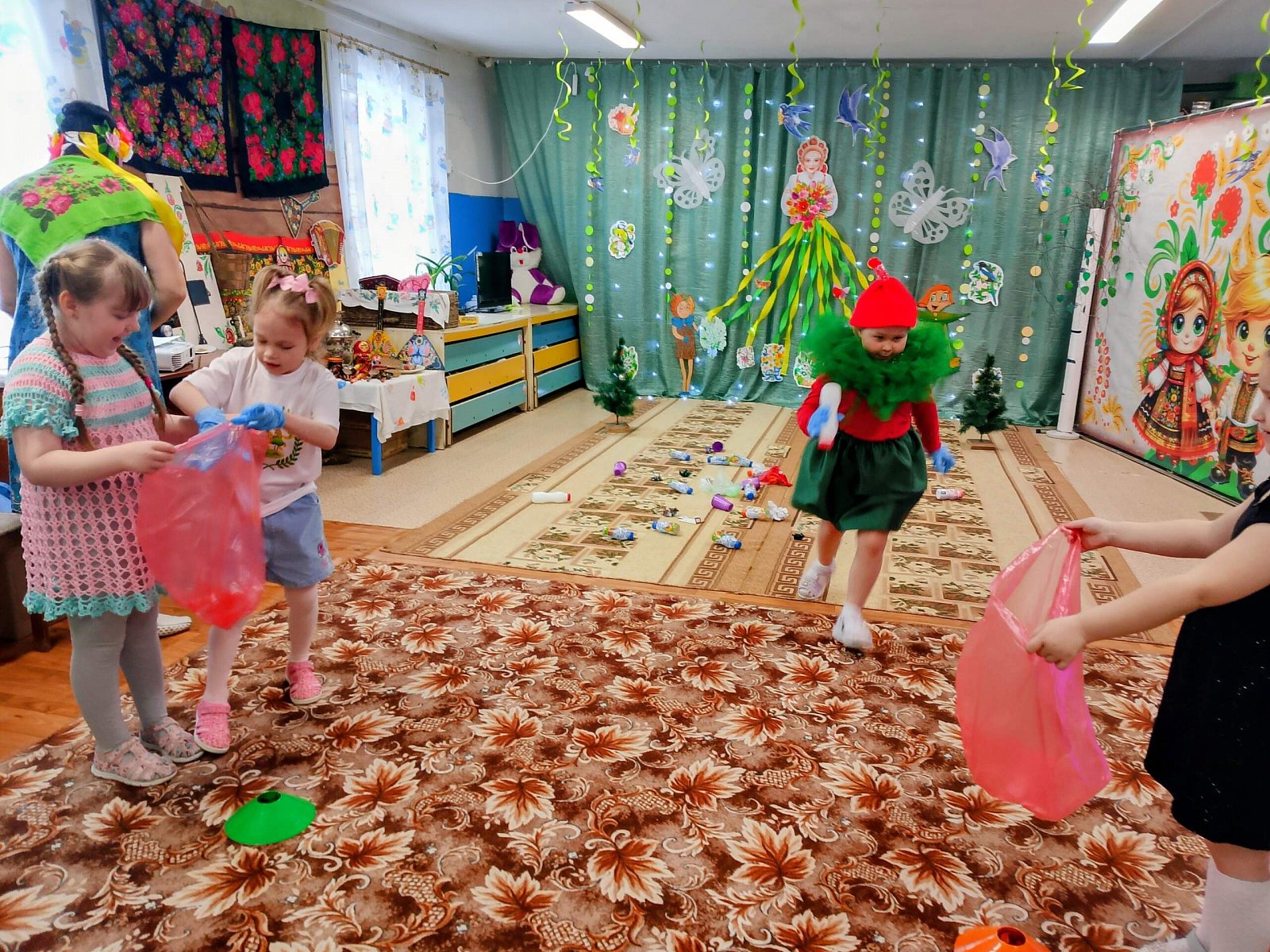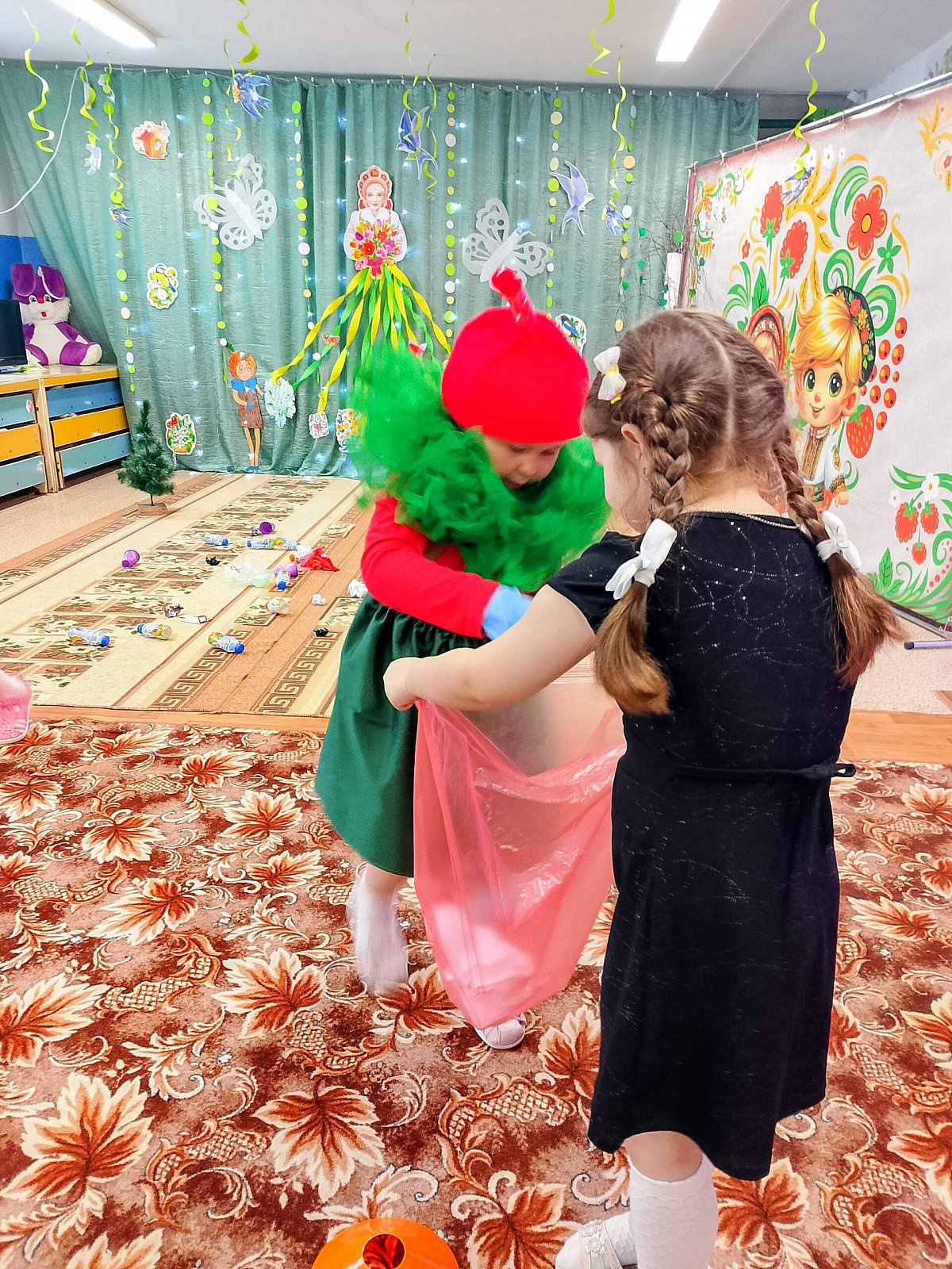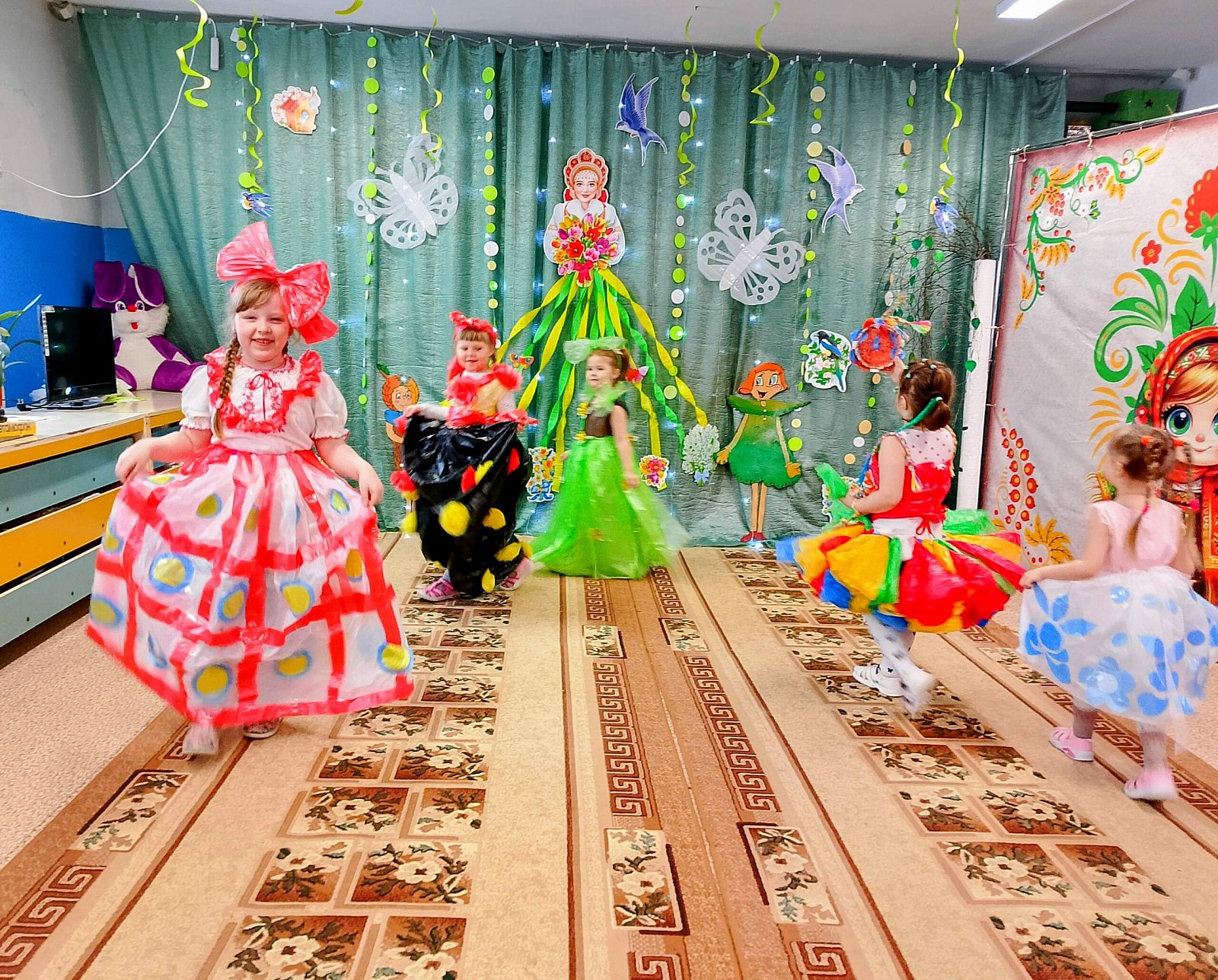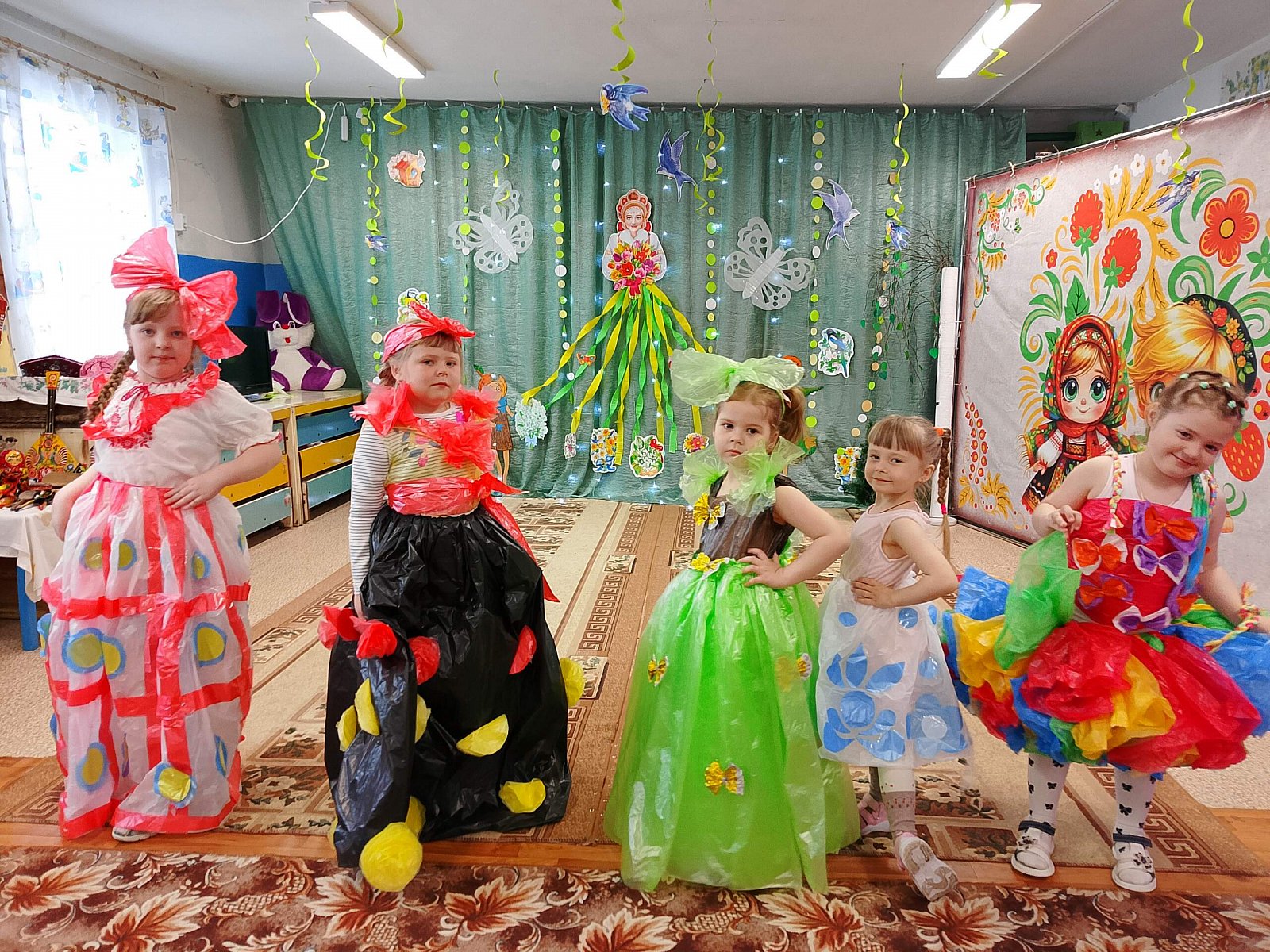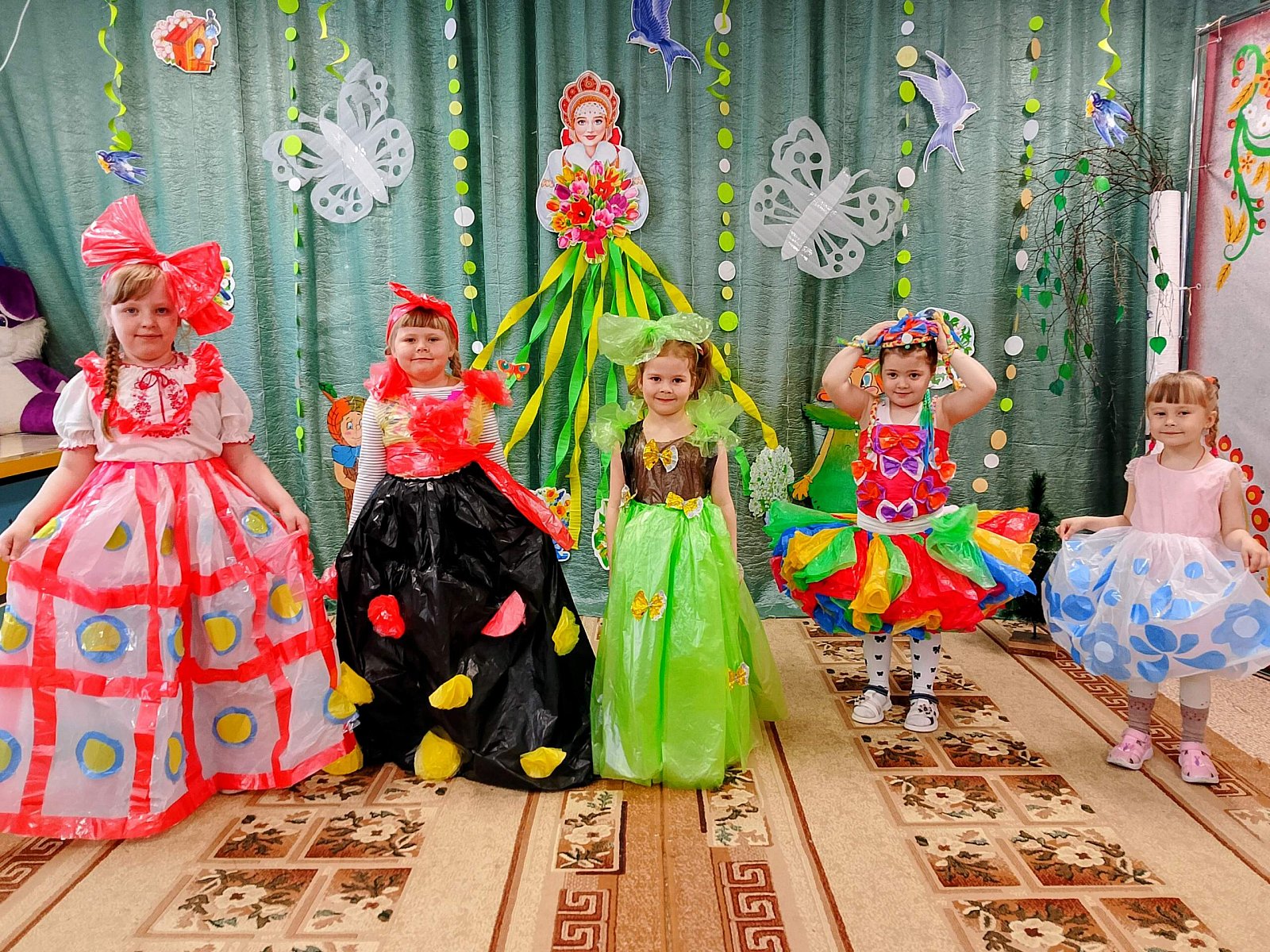 Наши ребята продемонстрировали свои таланты, устроив яркое дефиле модных нарядов, созданных исключительно из экологичных материалов – бумаги, картона, пластиковых бутылок и прочего вторсырья.