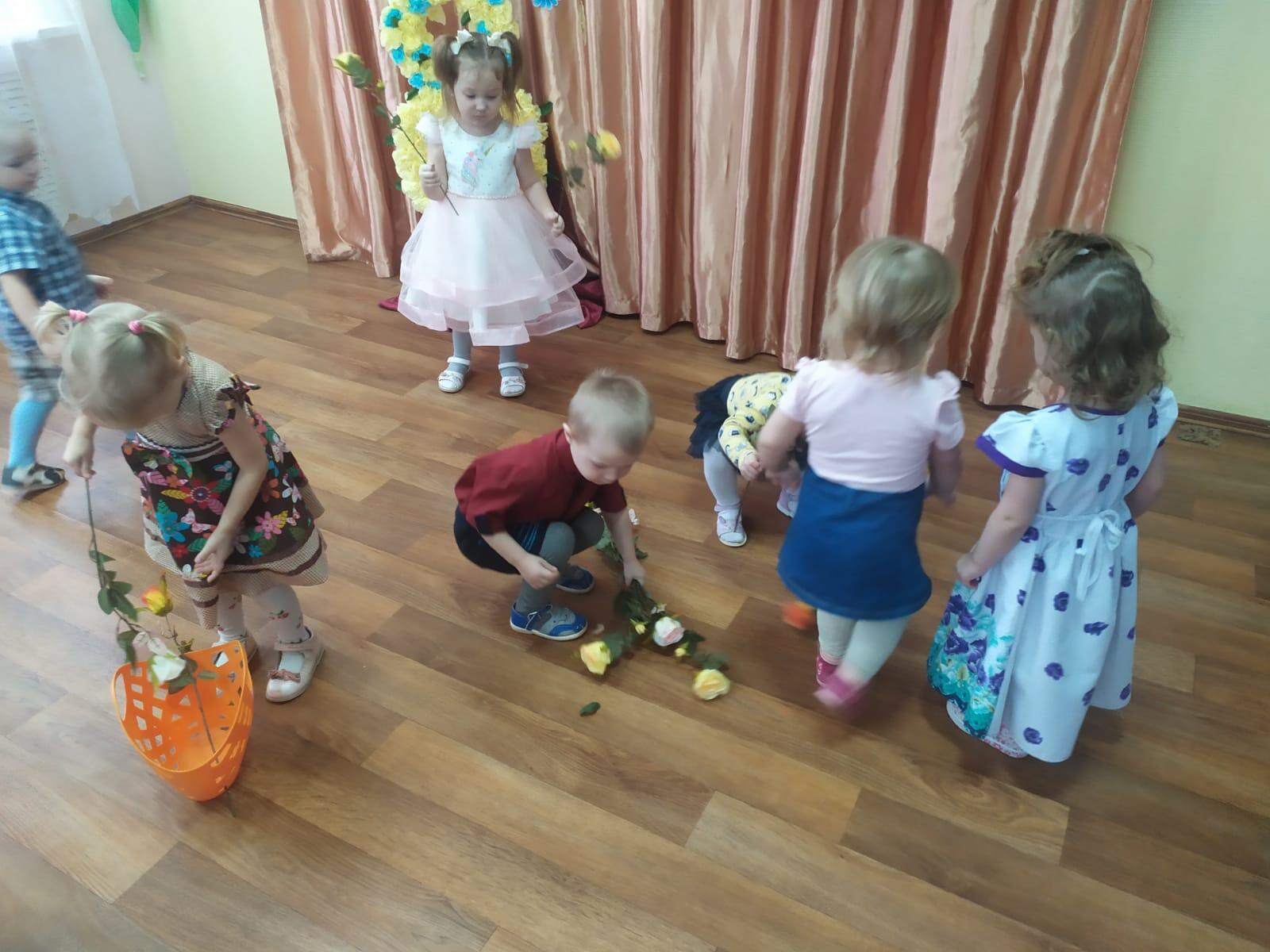 Малыши с большим удовольствием участвовали в таком прелестном празднике: они с удовольствием участвовали в играх "Собери цветы для мамы", весело танцевали задорные танцы с цветами и с ложками.