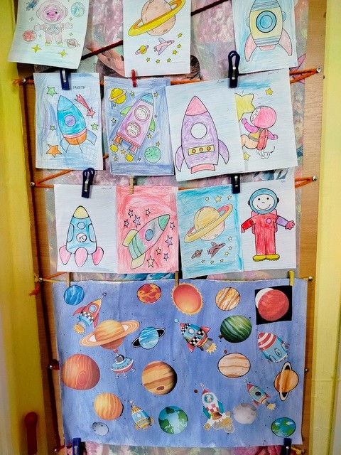 Знания полученные в детском саду дети закрепили в своих творческих работах. В группа была оформлены выставка детских работ, посвященных Дню космонавтики.