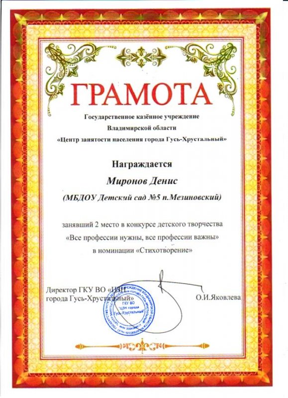 Участие воспитанников в муниципальном конкурсе "Все профессии нужны", организованным ГКУ ВО " центр занятости населения города Гусь - Хрустальный", 2019г. 2 место