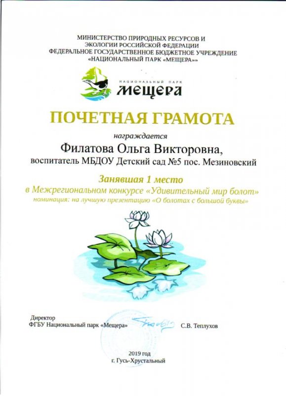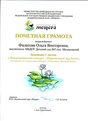 Участие педагогов в межрегиональном конкурсе "Удивительный мир болот", организованным Нп Мещера. Номинация на лучшую презентацию "О болотах с большой буквы", 2019 год,