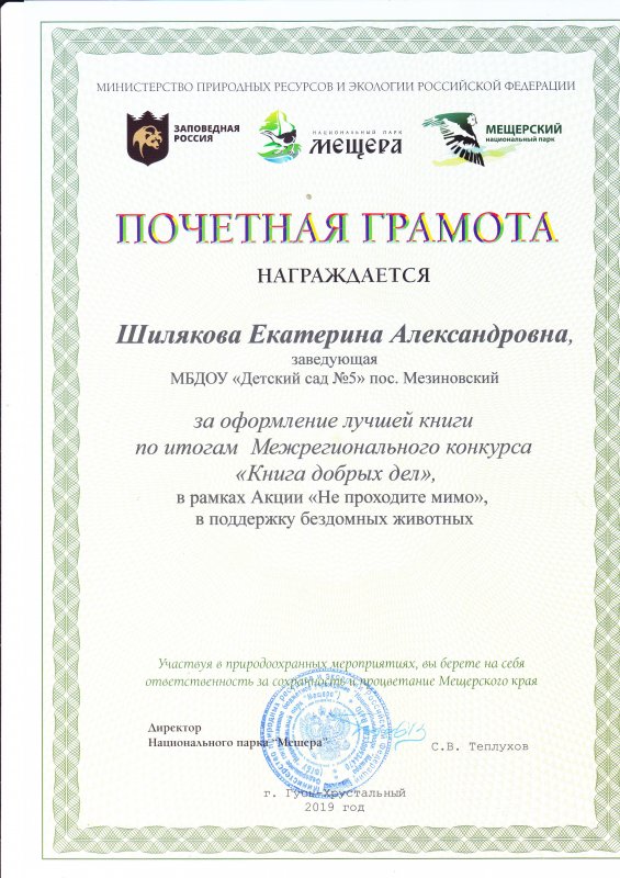 Участие педагогов в межрегиональном конкурсе на лучшую книгу "Книга добрых дел" в рамках Акции "Не проходите мимо" в поддержку бездомных животных, организованным НП Мещера, 2019 год