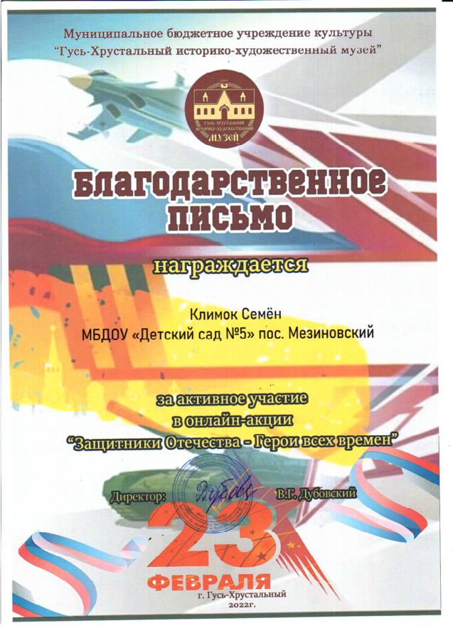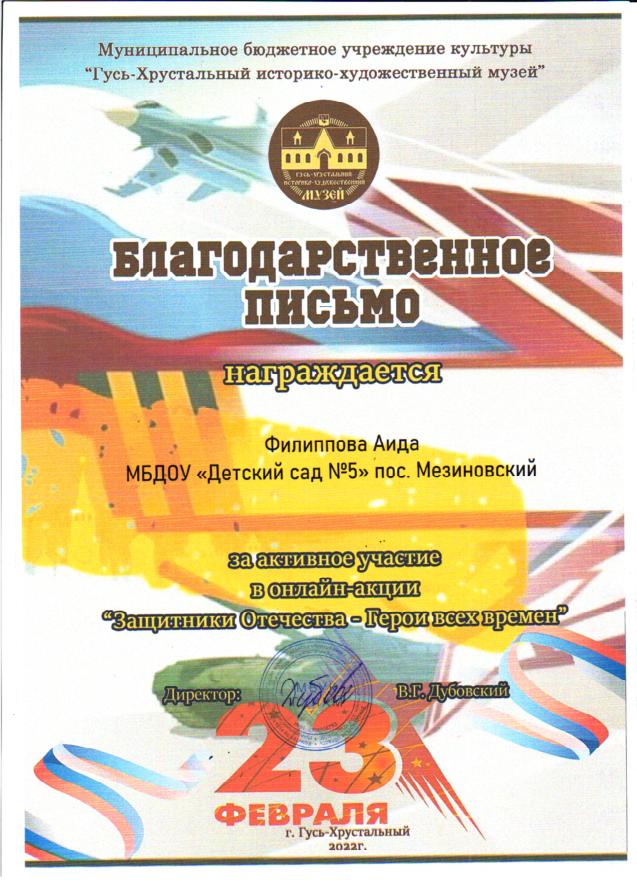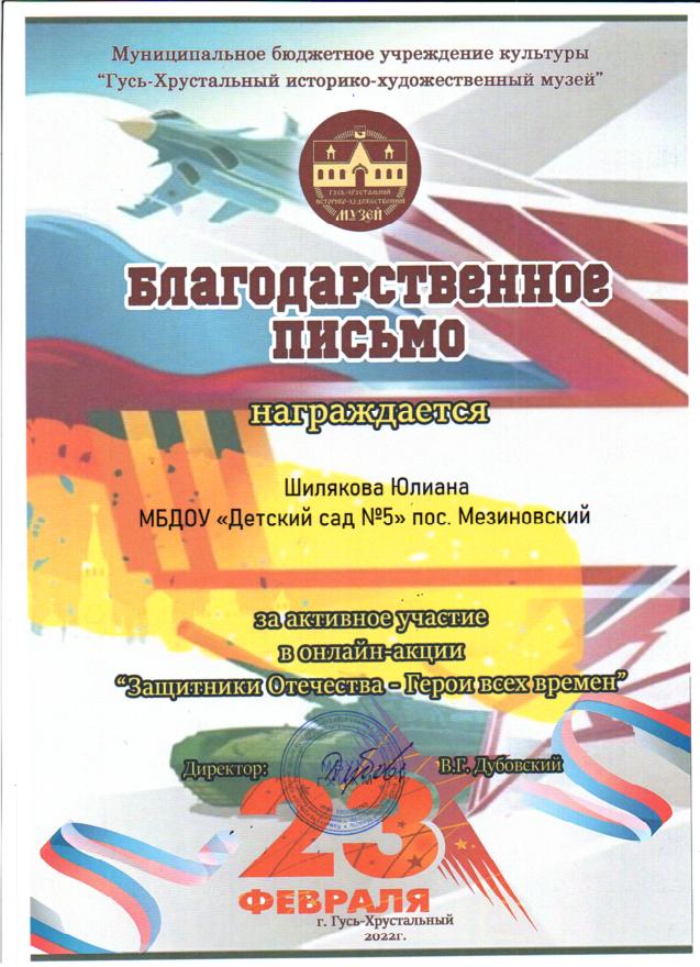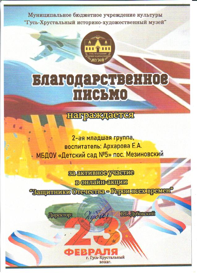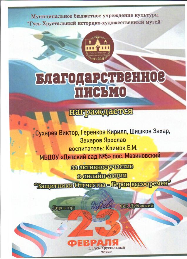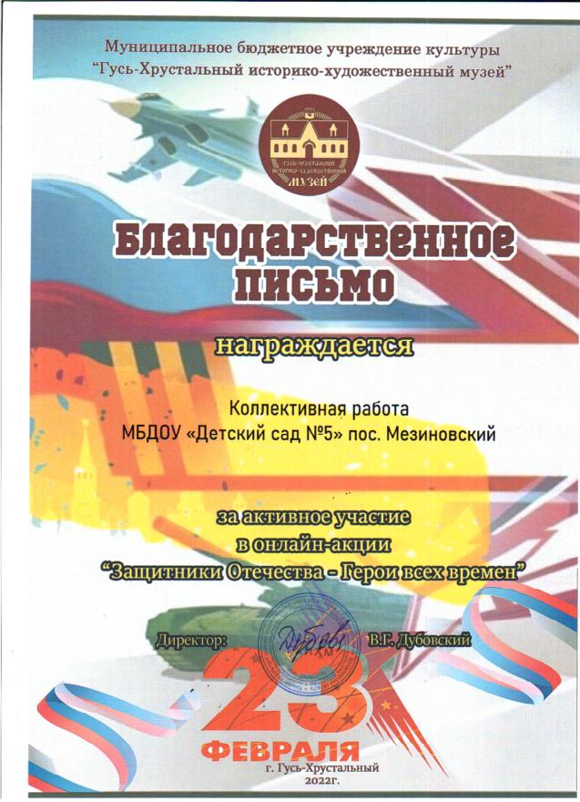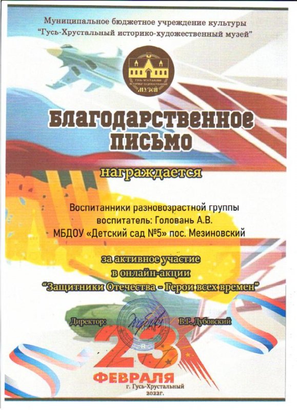 участие воспитанников в онлайн - акции "Защитники Отечества герои всех времен", организованной МБУК Гусь-Хрустальным историко -художественным музеем.