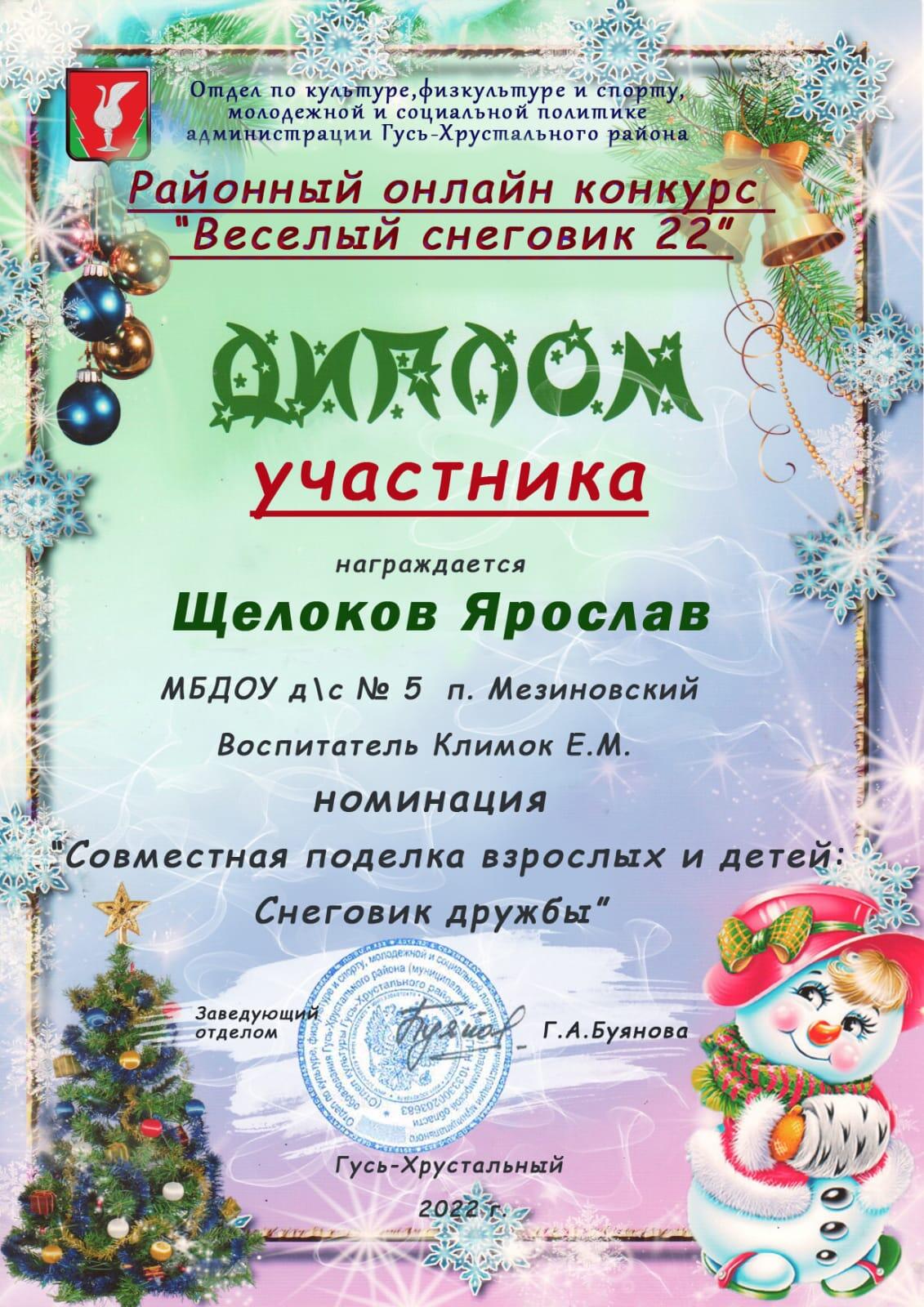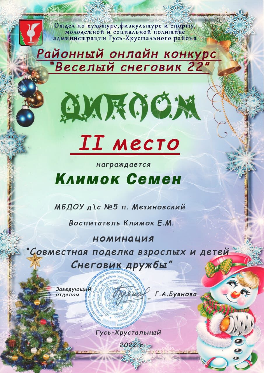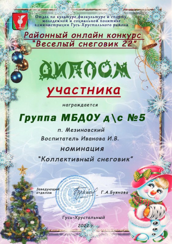 Участие воспитанников и педагогов в районном онлайн - конкурсе "Веселый снеговик -2022", организованным Отделом по культуре, физкультуре и спорту, молодежной и социальной политике администрации Гусь-Хрустального района
