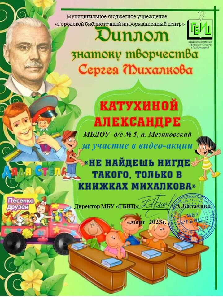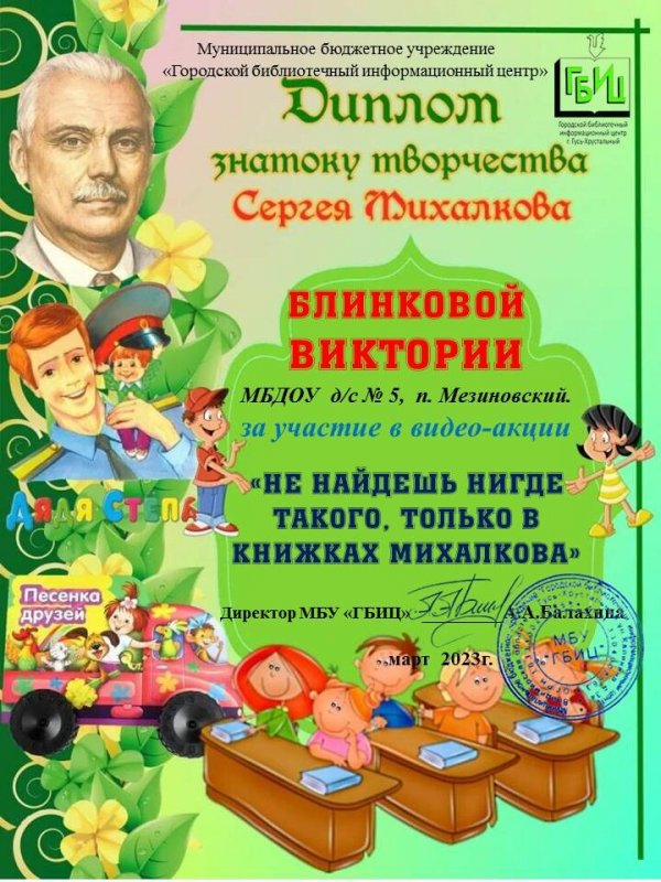 Участие воспитанников в видео - акции "Не найдешь нигде такого, только в книжках Михалкова", организованной МБУ ГБИЦ г. Гусь-Хрустальный