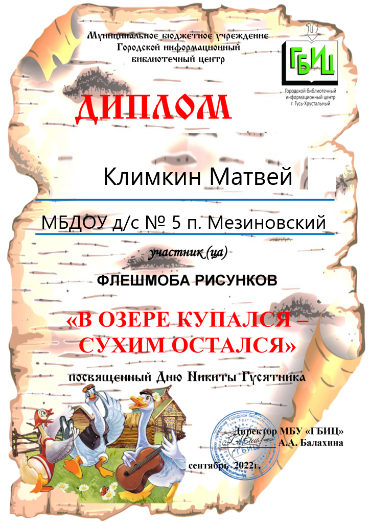 Участие воспитанников во флешмобе рисунков «В озере купался – сухим остался», посвященному празднику Дня Никиты-Гусятника и органгизованном МБУ «ГБИЦ» г. гусь-Хрустальный