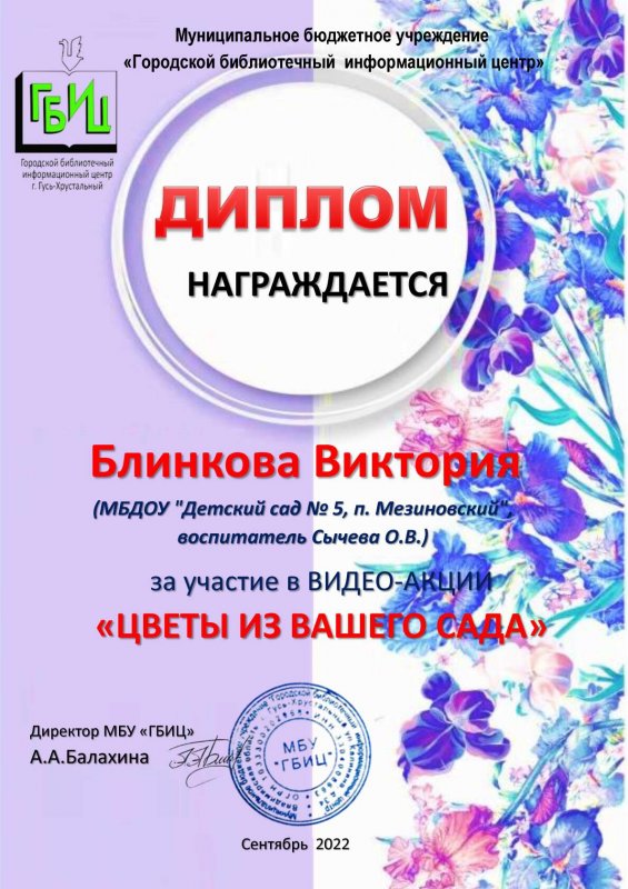 участие воспитанников в видео - акции "Цветы из вашего сада", организованной муниципальным бюджетным учреждением "Городской библиотечный информационный центр" г. Гусь-Хрустальный.