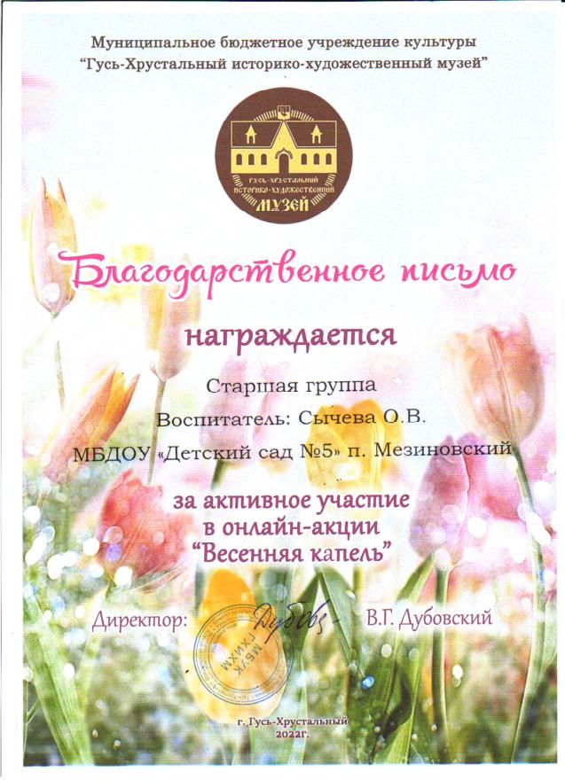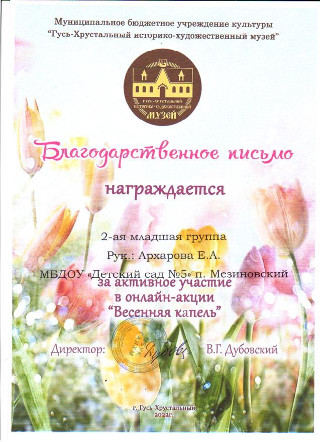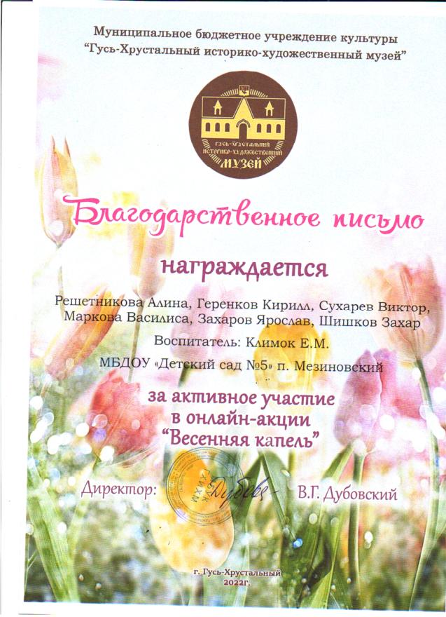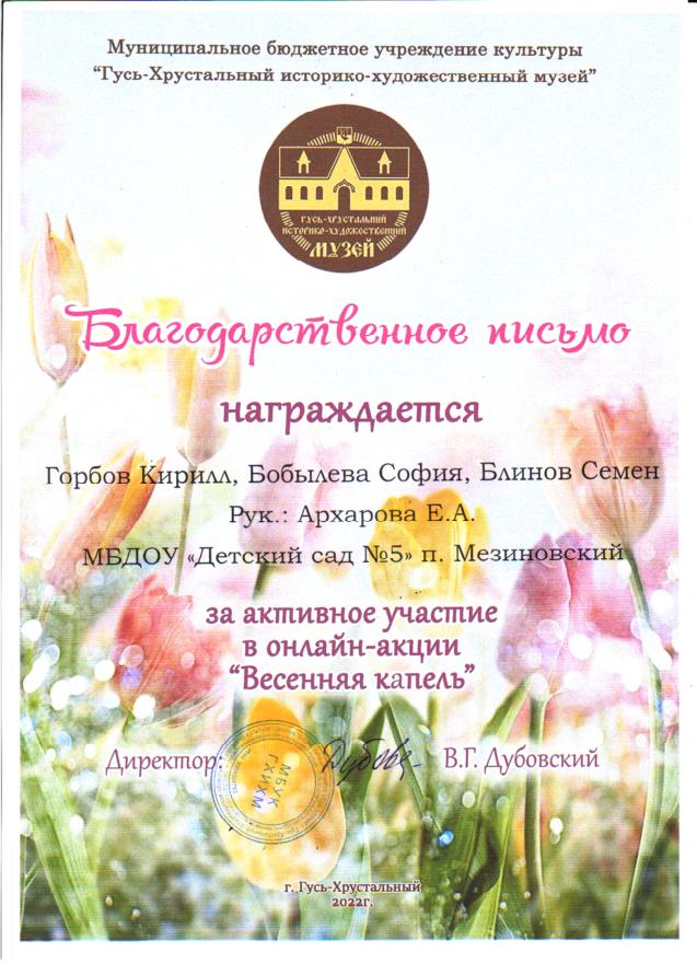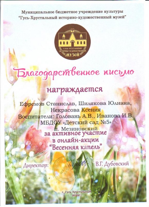 участие воспитанников в онлайн - акции "Весенняя капель", организованной МБУК "Историко - художественный музей", г. Гусь-Хрустальный