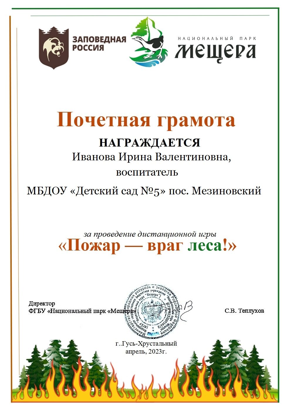 Проведение педагогами дистанционной игры "Пожар - враг леса", разработанной сотрудниками НП Мещера