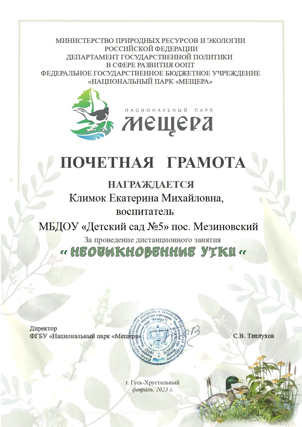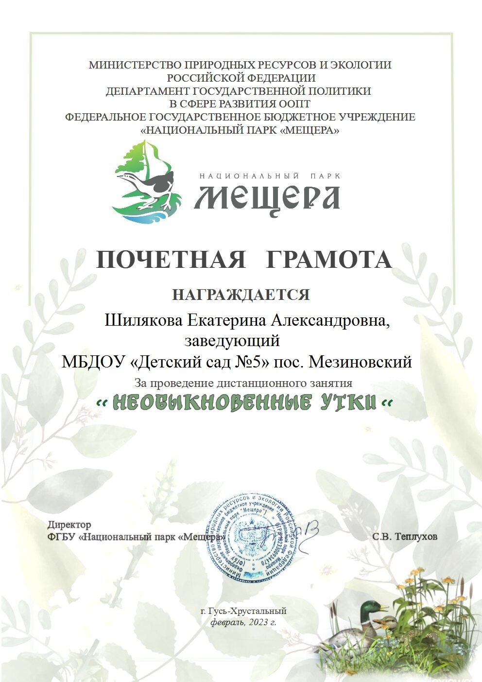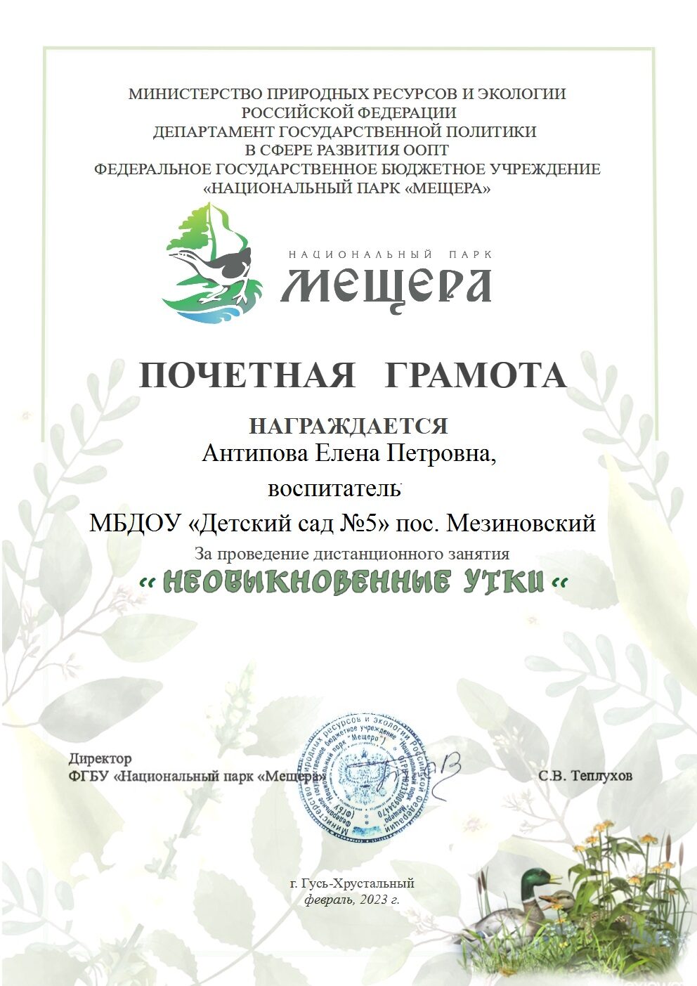 Организация и проведение воспитателями дистанционного занятия «Необыкновенные утки» от ФГБУ Национального парка «Мещера»