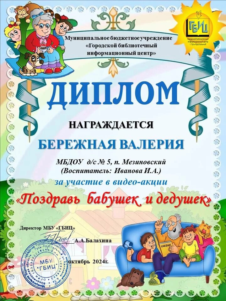 Участие воспитанников в видео - акции «ПОЗДРАВЬ БАБУШКУ И ДЕДУШКУ», организованной городским библиотечным информационным центром города Гусь-Хрустальный.