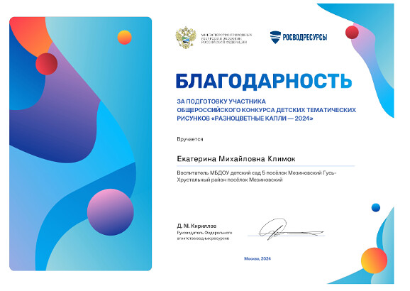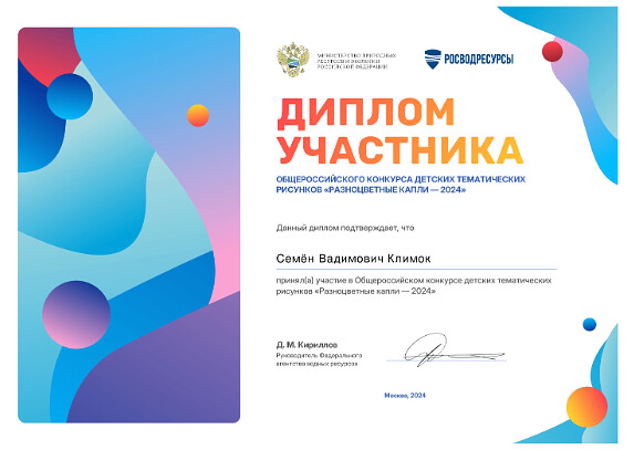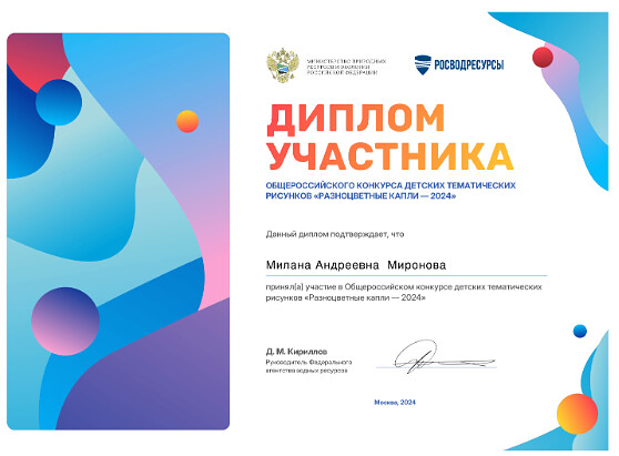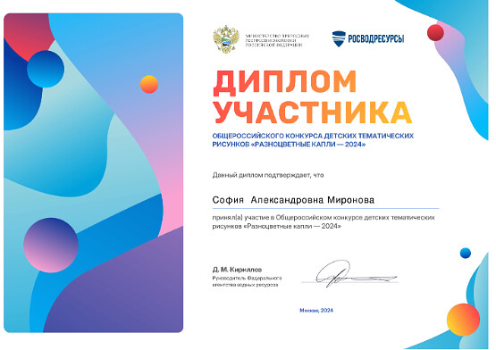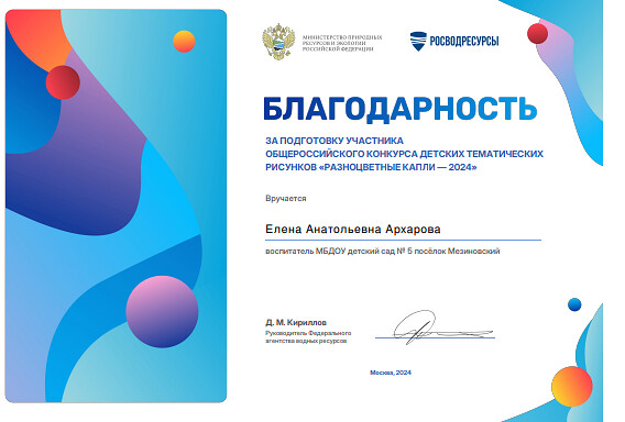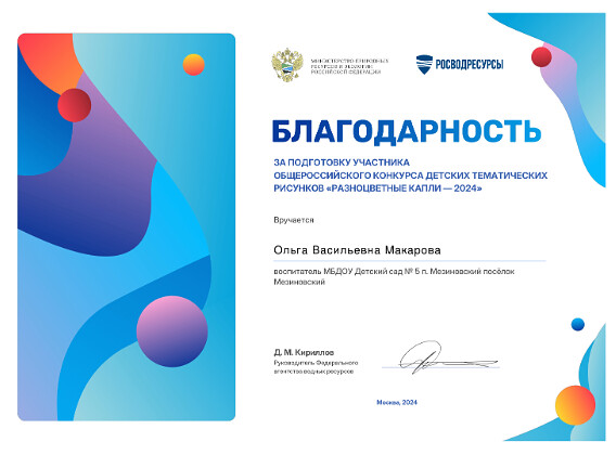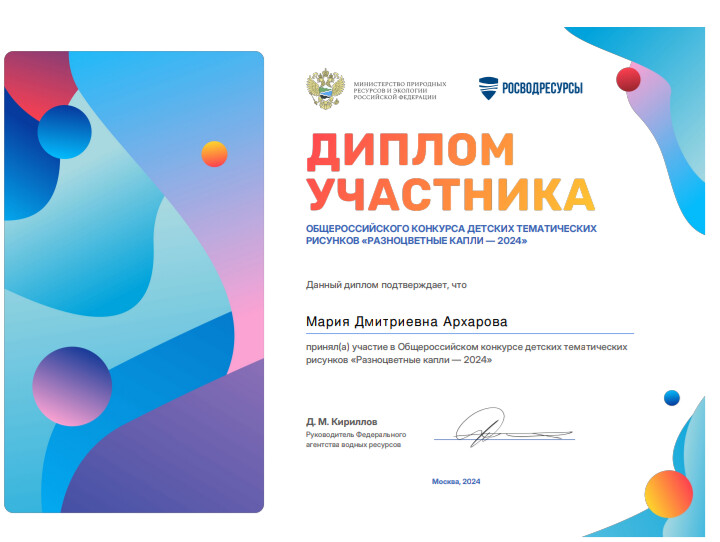 Участие воспитанников в Эколого-просветительском общероссийском конкурсе детских тематических рисунков «Разноцветные капли» в 2024 году, который проводит Федеральное агентство водных ресурсов (далее – Росводресурсы) при поддержке Министерства природных ресурсов и экологии Российской Федерации.
