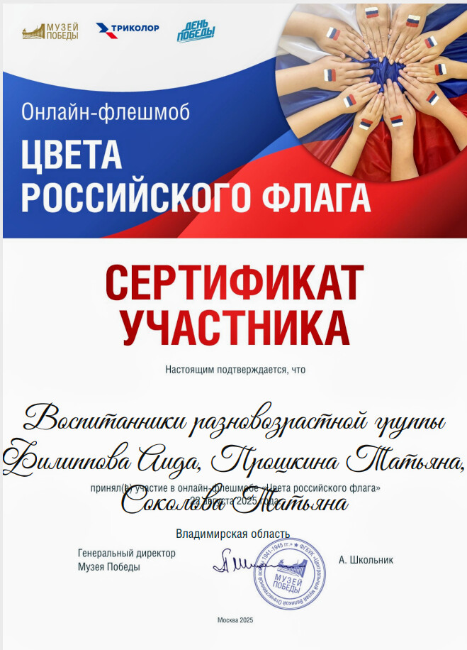 Участие воспитанников и педагогов во всероссийском патриотическом онлайн -флешмобе "Цвета российского флага", организованным Музеем Победы.